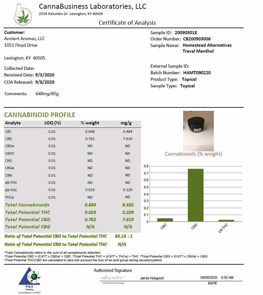 Ingredient Information: Aloe Vera Gel, Cocoa Butter, Hemp Seed Oil, Emulsifying Wax NF, Menthol Crystals, Leucidal Liquid SF, Soy Lecithin, Cannabidiol (CBD) derived from Mt. Folly Farm Organic Hemp (0.3% THC or below), Essential Oils, Peppermint, Rosemary, Wintergreen, Lemongrass, Camphor, and White Thyme.