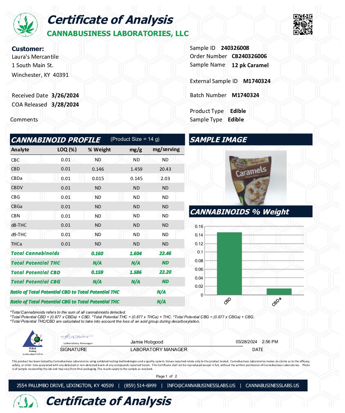 Ingredient Information: Corn Syrup, Caramel Creme (Milk, Corn Syrup, Cream, Whey, Salt, Sugar, Soy Lecithin), Sugar, Cream, Coconut Oil, Palm Oil, Cannabidiol from Agricultural Hemp, Salt.