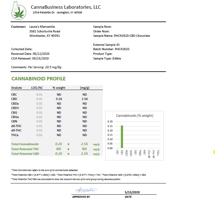 Ingredient Information: Chocolate Liquor (processed with Akali), Sugar, Cocoa Butter, Soy Lecithin (an Emulsifier), Vanilla, Cannabidiol (CBD) derived from Mt. Folly Farm Organic Hemp (0.3% THC or below).